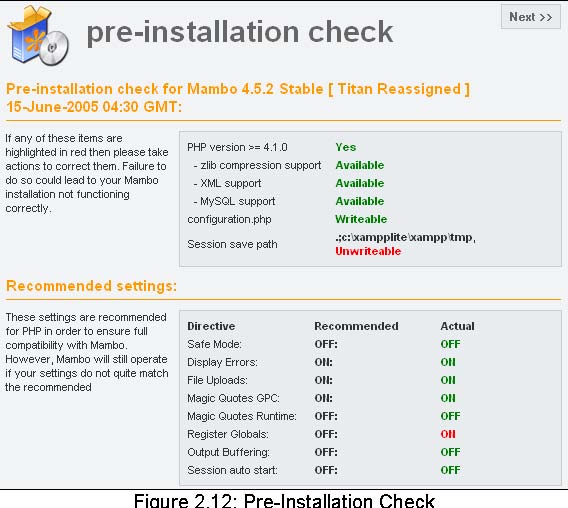 From now on, everything is going to go lightning fast because the Mambo web installer will be taking over command. Go to the URL http://localhost/mambo/ where the web installer announces itself with a pre-installation check. This check determines whether your environment is suitable for installing Mambo. If there are many green test results, then it is already a good sign. Depending on your configuration there can be differences here.