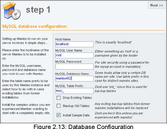Admin password: Mambo suggests a password. You can accept it or create a similarly complicated password. A simple one would be sufficient for a local installation.
