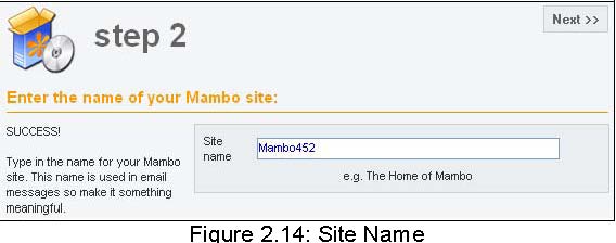 In step 2, you secure the name of your website. This name shows up in the header of the browser window when someone accesses your website. This name is also used in other places, for example, with confirmation e-mails to registered users. Select a meaningful name. For our example page, we have chosen the name mambo452. Click on Next to set the name.