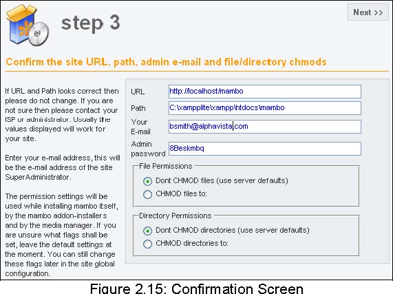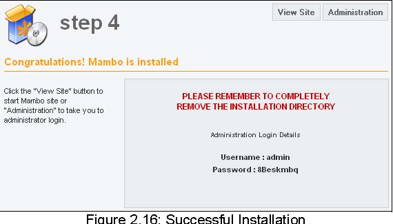 Mambo assigns a new password when you go backwards from step 4, for instance, if you want to change your settings or if the installation wasn't quite successful. If you have forgotten or mislaid the administrator password, there is a solution in the Appendix.