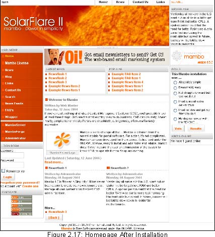 The result is very impressive. Look it over at your own pace, click on a few options, and try to orient yourself. Lot of Mambo's functionalities are used on this homepage, which is loaded with example data. We will take a good look at these.Page number and header should be as it appears in the book.